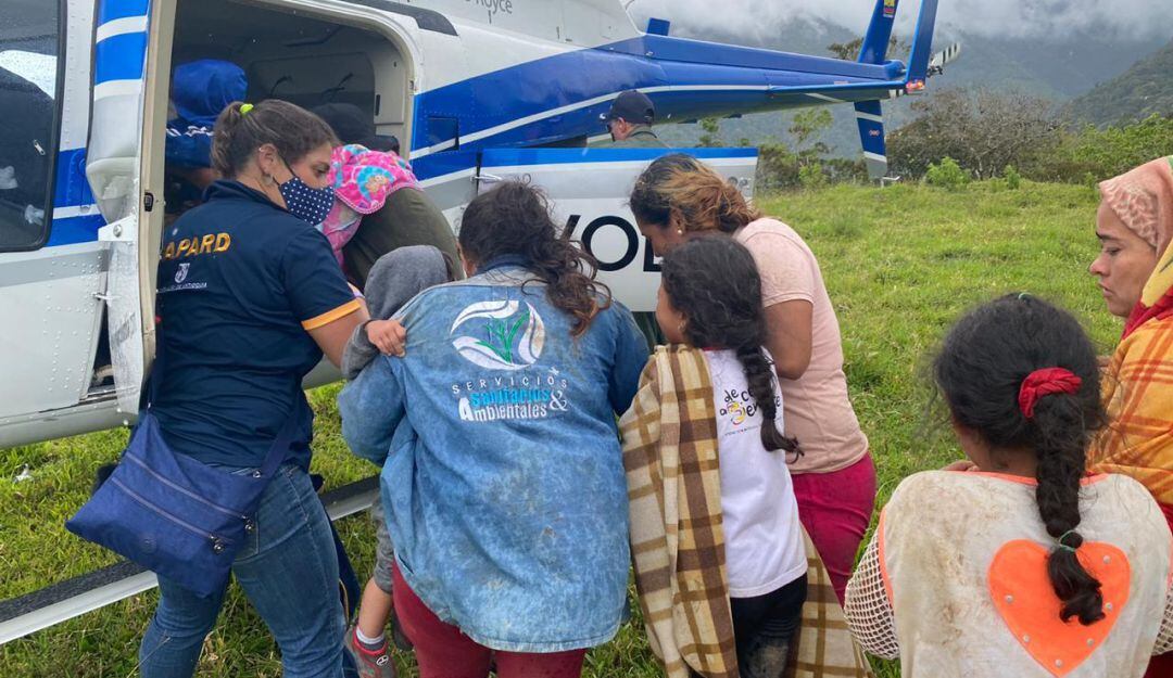 “Tenemos tres helicópteros destacados en el área, dos de la Gobernación y uno de la Fuerza Aérea para la extracción de las familias que quedaron en la zona alta de la montaña y en donde el acceso es imposible, estamos hablando de que son unas 500 familias, podemos hablar de 500 que estamos con los organismos evacuando y trasladando a albergues definidos en Debeiba”, dijo el Gobernador, Anibal Gaviria.