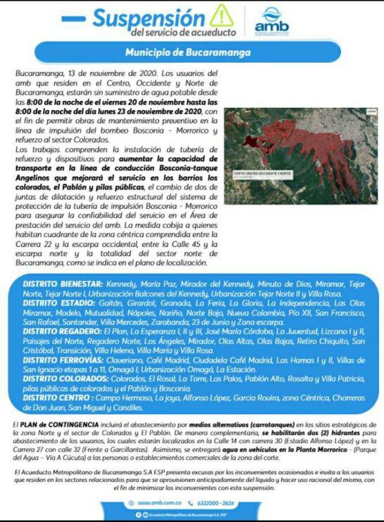 Además, "el cambio de dos de juntas de dilatación y refuerzo estructural del sistema de protección de la tubería de impulsión Bosconia - Morrorico para asegurar la confiabilidad del servicio en el área de prestación del servicio. La medida cobija a quienes habitan cuadrante de la zona céntrica comprendida entre la carrera 22 y la escarpa occidental, entre la calle 45 y la escarpa norte y la totalidad del sector norte de Bucaramanga".