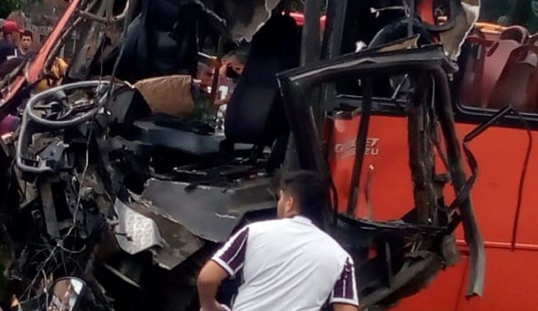 El vehículo de carga pesada quedó volcado sobre la vía, mientras que el parabrisas del bus quedó totalmente destruido. Según las autoridades viales, el bus no acató una señal de pare y colisionó con el otro automotor.