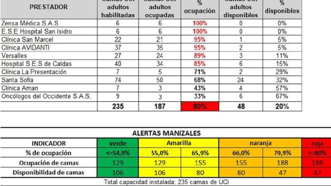 Caracol Radio conoció que el Secretario de Salud de Manizales, Carlos Humberto Orozco Téllez, les comunicó a los gerentes de los centros asistenciales de la ciudad que en la capital caldense se podría declarar próximamente la alerta roja hospitalaria, ya que seis instituciones tienen la ocupación de camas UCI en su totalidad o están cerca de completar su capacidad máxima.