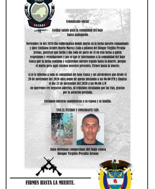El grupo criminal Los Caparros declararon paro armado entre el viernes 20 de noviembre y el lunes 23, por la muerte de su máximo líder alias Caín.