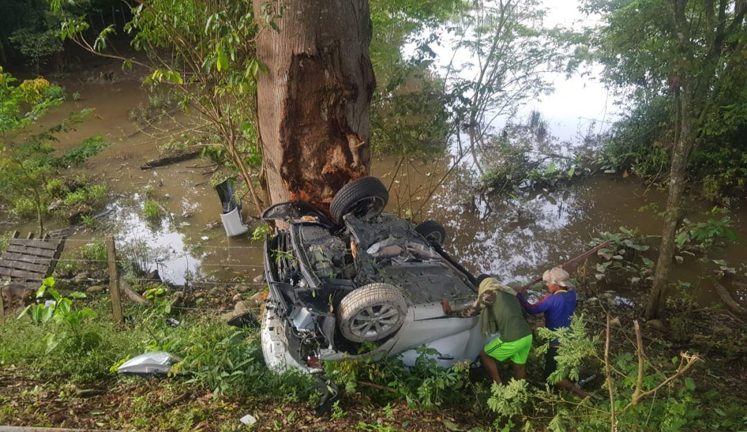 La camioneta en la que se moviliza se salió de la vía se estrelló contra un árbol y quedo con las llantas hacía arriba. Los organismos de socorro intentan rescatar el cuerpo del vehículo que quedó destruido.