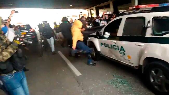 El Secretario de Gobierno, Luis Ernesto Gómez, publicó en su cuenta de Twitter un video que muestra como los manifestantes están golpeando una patrulla de policía cerca de la Universidad Nacional.