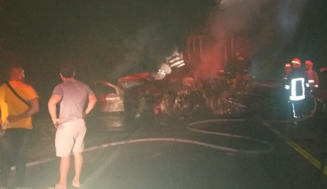El Comandante del Cuerpo de Bomberos del municipio de Sitio Nuevo, Magdalena, Alan Bocanegra, afirmó que uno de los vehículos particulares fue consumido por el fuego y una camioneta se salió de la vía.
