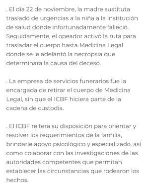 Además, en este comunicado mencionan que “la madre sustituta trasladó de urgencias a la niña a la institución de salud donde infortunadamente falleció. Seguidamente, el operador activó la ruta para trasladar el cuerpo hasta Medicina Legal donde se le adelantó la necropsia que determinara la causa del deceso. La empresa de servicios funerarios fue la encargada de retirar el cuerpo de Medicina Legal, sin que el ICBF hiciera parte de la cadena de custodia”.