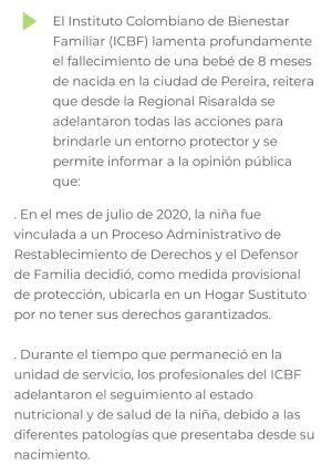 El ICBF asegura: “El Instituto Colombiano de Bienestar Familiar (ICBF) lamenta profundamente el fallecimiento de una bebé de 8 meses de nacida en la ciudad de Pereira, reitera que desde la Regional Risaralda se adelantaron todas las acciones para brindarle un entorno protector y se permite informar a la opinión pública que durante el tiempo que permaneció en la unidad de servicio, los profesionales del ICBF adelantaron el seguimiento al estado nutricional y de salud de la niña, debido a las diferentes patologías que presentaba desde su nacimiento”.