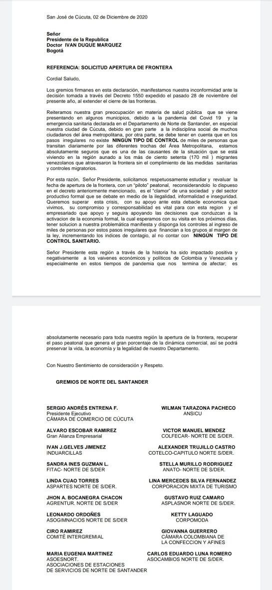 "Nosotros los gremios organizados de la ciudad hicimos una petición formal al Gobierno Nacional que considere la apertura de una manera organizada el tema fronterizo, venimos afectados por toda la situación y creemos que la apertura es un paliativo para el aporte económica que necesita. La frontera formalmente está cerrada pero bien sabemos que por las trochas la frontera está abierta y es permeable en forma desorganizada, debemos hacer ver que en realidad está abierto y que a través de las trochas no se puede garantizar los temas de bioseguridad, por el contrario si hacemos una apertura controlada con medidas de los dos lados podemos evitar que la gente pase por estos pasos ilegales, queremos que el gobierno nos dé una alternativa con un plan piloto más allá de los temas diplomáticos de Caracas-Bogotá. Ya es la tercera carta y no hemos recibido ninguna respuesta", dijo el empresario.