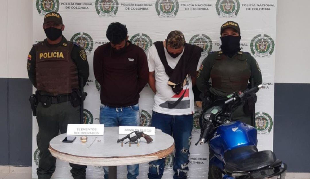 Estos dos presuntos delincuentes, minutos antes intimidaron a un ciudadano despojándolo de un reloj marca Invicta, una cadena y un celular de gama alta, siendo interceptados por los policías de la Metropolitana de Cartagena quienes logran su captura, siendo puestos a disposición de la Fiscalía General de la Nación por los delitos de hurto agravado y calificado, y tráfico, fabricación y porte ilegal de armas de fuego, partes o municiones.