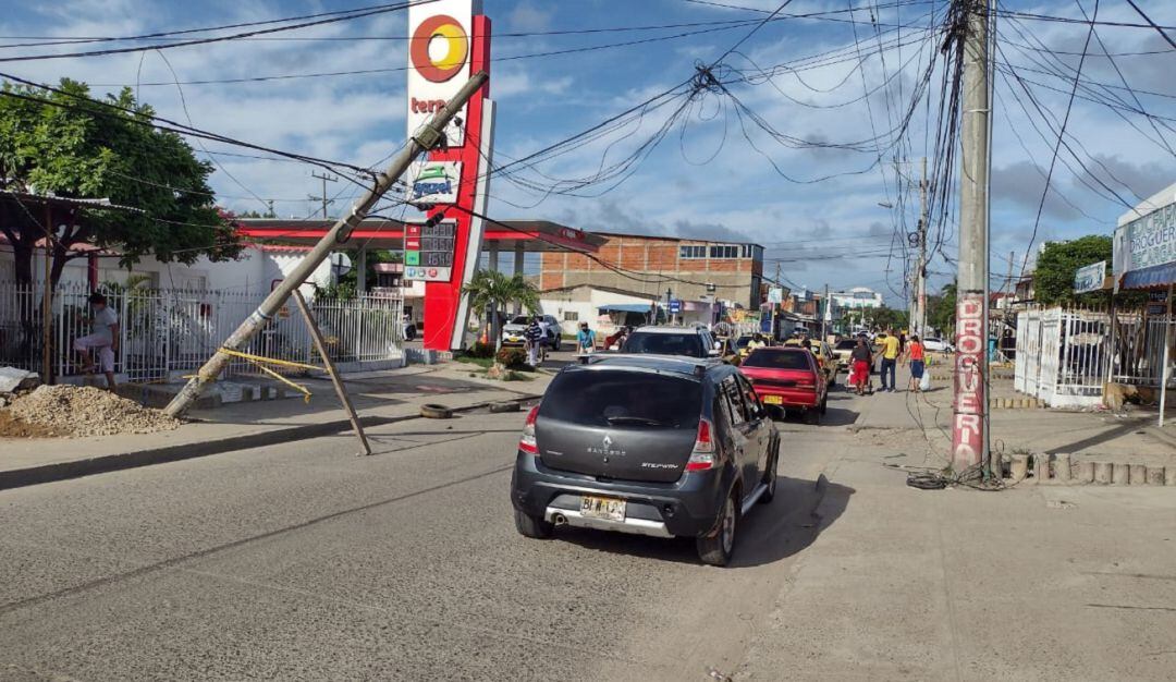 A escasos 50 metros de la tradicional bomba El Tigre en el barrio Olaya de Cartagena, un poste sufrió averías y se inclinó peligrosamente sobre la Avenida Pedro Romero.