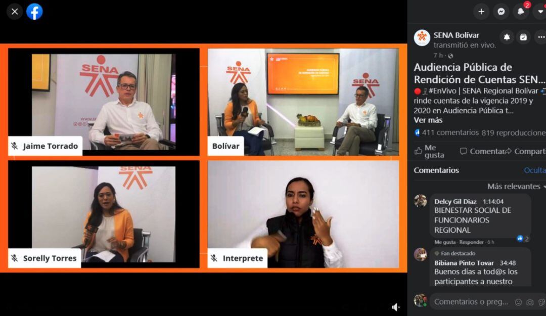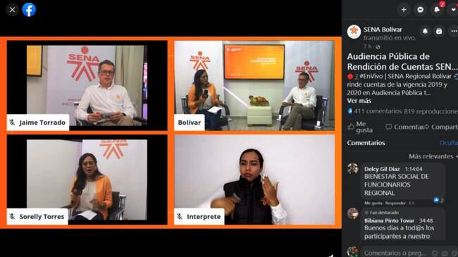 El SENA regional Bolívar realizó este miércoles 9 de diciembre la Audiencia Pública de Rendición de Cuentas 019 – 2020, la cual se realizó de forma virtual y se transmitió en vivo a través de la cuenta oficial de la Entidad en Facebook, @SENABolivarOficial; atendiendo las medidas adoptadas para evitar concentraciones y prevenir el contagio por Covid-19.