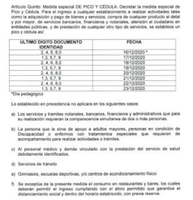 En primer lugar, regresa el pico y cédula, iniciando el día de hoy con las cédulas terminadas en números pares, esta medida se toma con el fin de controlar el aforo en los establecimientos de comercio, los restaurantes estan exentos de esta medida.