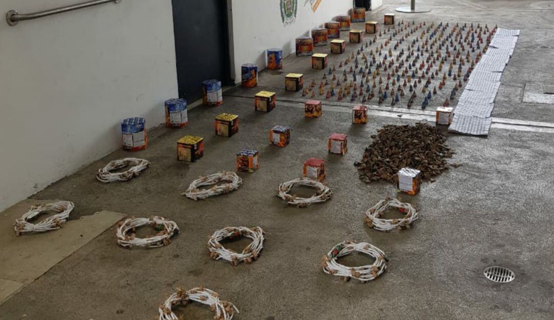 En un primer operativo, las autoridades hallaron 70 kilos de material pirotécnico, avaluado en 6 millones de pesos, entre los cuales se encontraban 7.920 totes, 1.536 papeletas, 310 pilas, y tortas, pilas y tiros en menor cantidad.