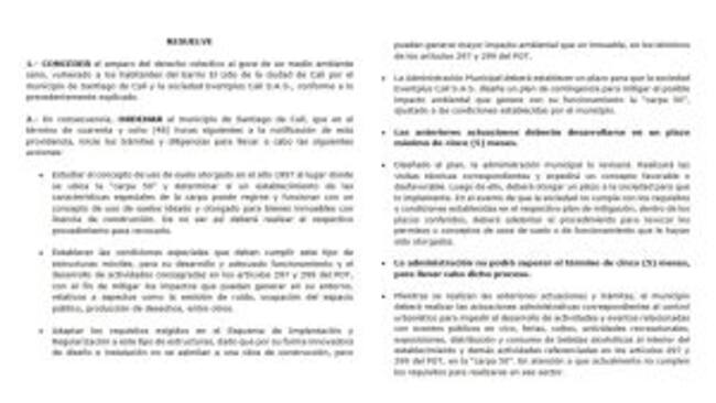 La acción popular que había sido interpuesta por la comunidad del barrio el Lido finalmente obtuvo una respuesta. En ella los habitantes exigían la protección de los derechos al goce de un medio ambiente sano, la seguridas y salubridad públicas y la moralidad administrativa.