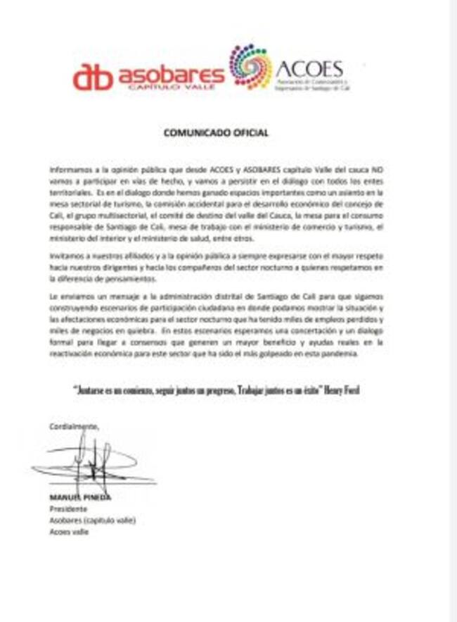 Ante las convocatorias que se han venido organizando a través de las redes sociales, por parte de distintos sectores del comercio nocturno para manifestarse en contra de las restricciones que ha implementado la alcaldía durante estos días, desde ASOBARES y la ACOES, se expidió un comunicado aclarando que ellos no participarán en estas vías de hecho y que siempre optarán por el diálogo.