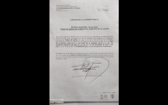 Ante la preocupación de que viajeros provenientes de Bogotá y otros municipios lleguen a la Calera (Cundinamarca), su alcalde Carlos Cénen Escobar anunció que el territorio tendrá la medida restrictiva de toque de queda, del 24 de diciembre al 11 de enero, en el horario comprendido entre las 10:00 de la noche a las 5:00 de la mañana.