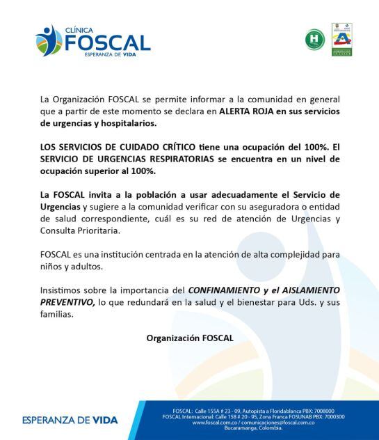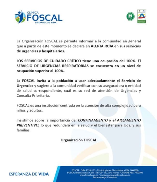 A pocas horas de la celebración del 24 de diciembre la clínica Foscal en Floridablanca se declaró en alerta roja después de llegar a la ocupación máxima en las unidades de urgencias.