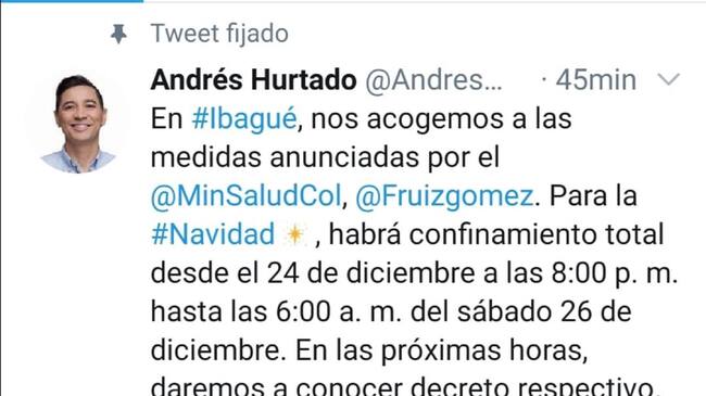 Este fue el anuncio del alcalde de Ibagué, Andrés Hurtado. / Imagen tomada del Twitter del alcalde Andrés Hurtado