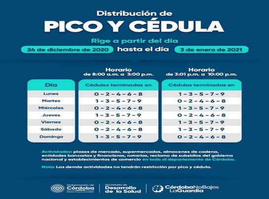 También dentro de las medidas concertadas en mesa técnica con los alcaldes del Departamento y recibida la autorización de Ministerio del Interior, se implementará pico y cédula que regirá desde el 24 de diciembre del 2020 al 3 de enero del 2021 en el territorio cordobés.