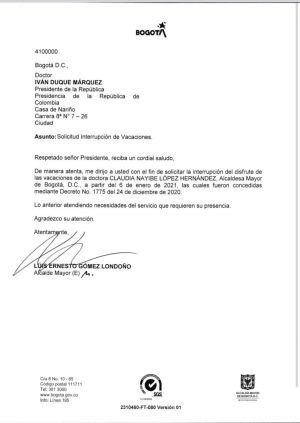 La alcaldesa desde el primer día de este 2021 había dejado como alcalde encargado al secretario de Gobierno Luis Ernesto Gómez quien estaría en este cargo hasta el próximo 12 de enero. Sin embargo a partir de el miércoles 6 de enero ya cada quien tomaría su cargo y todo volvería a la normalidad.