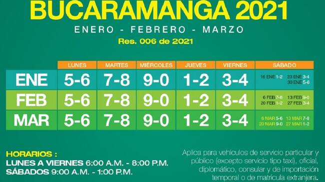 Como se recordaré en Bucaramanga la medida rotará cada tres meses; durante el periodo comprendido entre enero y marzo, los dígitos aplicarán de la siguiente manera: