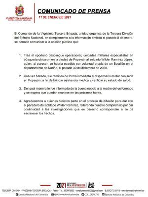 El soldado Wilder Ramírez López, que había sido reportado como desaparecido a través de las redes sociales por su mamá, la señora Beatriz López, desde el pasado 30 de diciembre, apareció sano y salvo en la ciudad de Popayán.