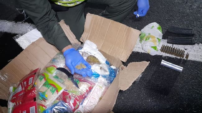 Durante los operativos de control en las carreteras la Policía de Caldas encontró en un camión de una empresa de encomiendas un cargamento de sustancias estupefacientes y municiones, los cuales estaban camuflados en una caja de cartón con víveres.