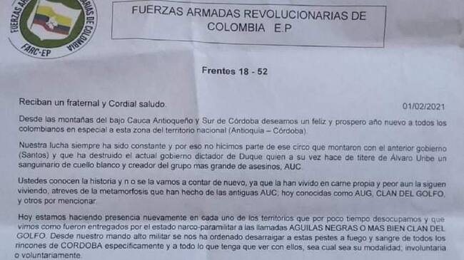 Según el panfleto que tiene bastante preocupada a la población rural, deja ver que este grupo ilegal intensificará la ofensiva contra las Autodefensas Gaitanistas de Colombia y toda aquella persona que sea declarada enemiga de las disidencias. En el pasquín, también aseguran que la orden llegó del comando de la llamada segunda Marquetalia y aseguran que son zonas que antes ocuparon, pero que el Estado supuestamente le entregó a las AGC luego del proceso de paz.