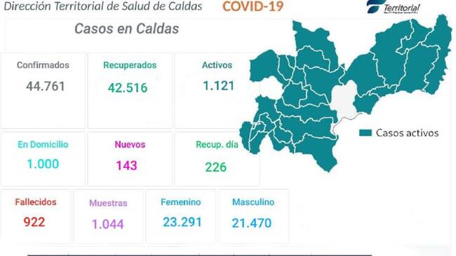 De acuerdo con el informe, Caldas llega a 44.761 personas contagiadas por coronavirus, 42.516 se han recuperado y 1.121 siguen activos. A la fecha 922 han fallecido por la enfermedad
