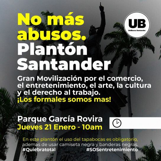 Será un plantón frente a la Alcaldía de Bucaramanga mañana jueves, 21 de enero, a las 10:00 de la mañana del que harán parte los dueños de bares, discotecas, DJ, y comerciantes del entretenimiento nocturno que protestan por las medidas restrictivas que ha tomado la Gobernación de Santander y alcaldes del área metropolitana de Bucaramanga y que afectan al gremio como el toque de queda desde las 8 de la noche.