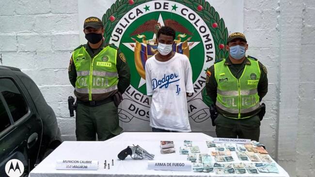 En un plan candado desplegado por policías de los cuadrantes de la Estación Virgen y Turística, en el sector Campamento del barrio Olaya Herrera, fue capturado en flagrancia Eduardo Luis Castro Vallejo, de 30 años, sorprendido en poder de un arma de fuego, tipo revólver, calibre 38, la suma de 500 mil pesos en efectivo y una libreta de cobra diario, hurtados a un comerciante.