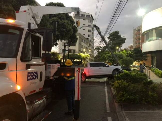 Una camioneta de alta gama se estrelló contra un poste de luz en la carrera 29 con calle 48 de Bucaramanga; el impacto averió el sostén de las cuerdas de la energía y por poco lo derriba reportaron oyentes de Caracol como Fernando Rojas.