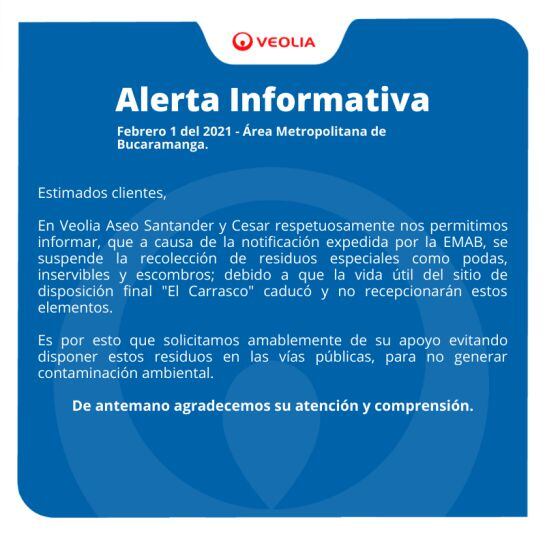 Mediante una circular la Empresa Municipal de Aseo de Bucaramanga, Emab, notificó a las empresas que se encargan de la recolección de basura en el Área Metropilitana, que desde la fecha no se recibirán en El Carrasco residuos especiales.