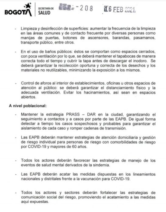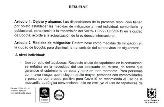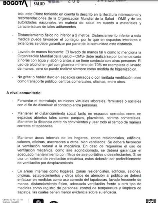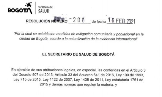 El decreto 208 del Distrito conocido por Caracol Radio excluye la toma de la temperatura, el uso de tapetes con alcohol y otras medidas.
