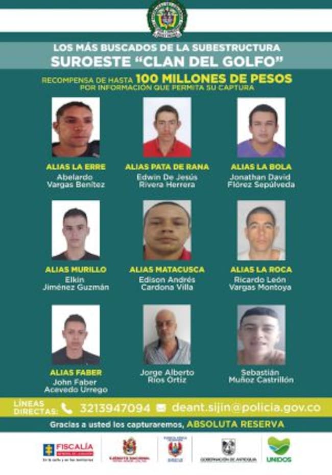 “Por estos delincuentes se ofrece una recompensa de hasta 100 millones de pesos a las personas que nos den información que permita capturar a estos delincuentes de esta estructura del Clan del Golfo”, agregó el funcionario.