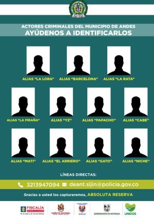El funcionario también indicó que publicaron otro cartel con 10 alias de personas que aún no están individualizadas y su rostro aún no lo conocen las autoridades, pero solicitan colaboración de la comunidad para poder identificarlos. Estas personas delinquen en el municipio de Andes, en el suroeste de Antioquia.