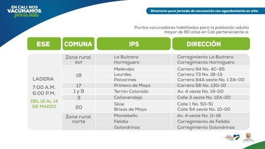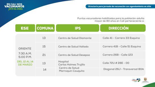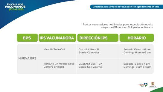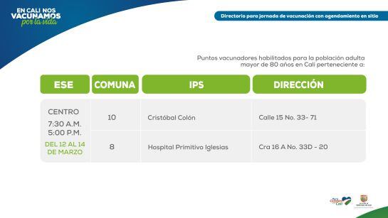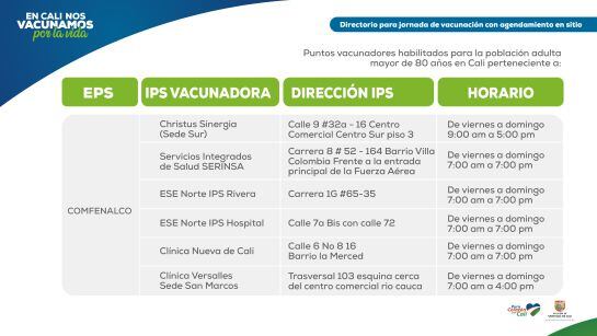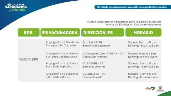 Esta dinámica de vacunación va a permitir que los adultos mayores de 80 años puedan dirigirse a más de 30 puntos de vacunación durante los días viernes 12, sábado 13 y domingo 14, sin tener agendada una cita, explicó la secretaria de Salud de Cali Miyerlandi Torres.