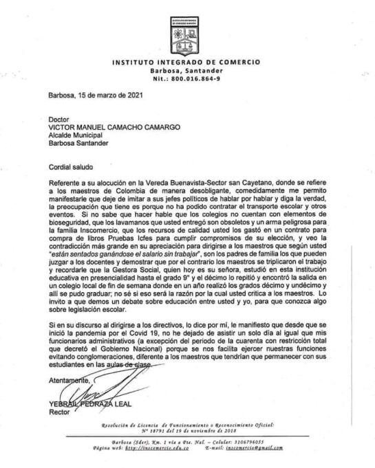 El rector del Instituto Integrado de Comercio, Yebrail Pedraza, calificó estas declaraciones como una infamia y pidió al alcalde retractarse de lo que dijo.
