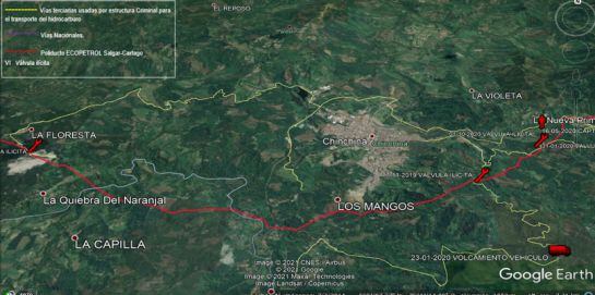 De acuerdo con las investigaciones los cabecillas de esta estructura criminal conocidos con los alias de 'Puchis' y 'Toto'; alquilaban fincas en los municipios de Villamaría y Chinchiná haciéndose pasar por campesinos de la zona. En las noches aprovechaban para instalar válvulas ilegales sobre el poliducto para extraer el combustible, y posteriormente comercializarlo a bajos precios en el Eje Cafetero y Cundinamarca.