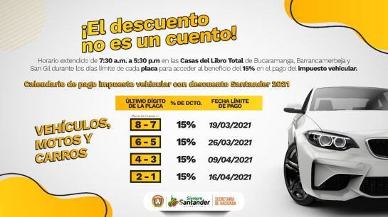 La Gobernación de Santander anunció que el último día de plazo para el pago del impuesto vehicular, la casa del Libro total de Bucaramanga, Barrancabermeja y San Gil, atenderá en horario extendido para que los contribuyentes se pongan al día.