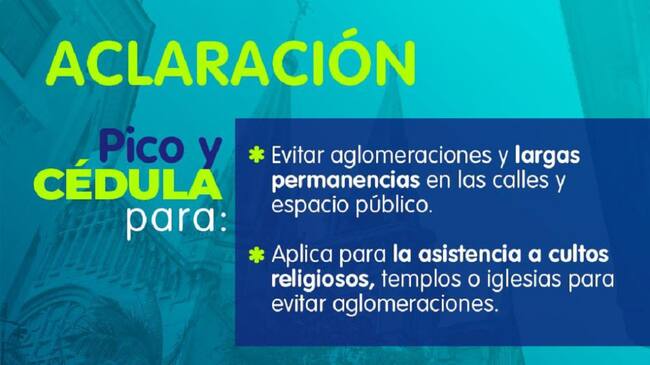 - En relación a la celebración de los cultos religiosos, deberá aplicarse el pico y cédula definido para ese día: día impar, cédulas impares; día par, cédulas pares. También deberán contar con los protocolos de bioseguridad y con el aforo establecido para estas actividades.