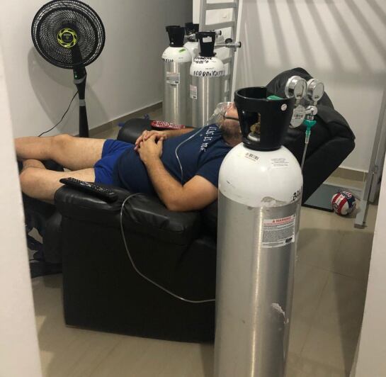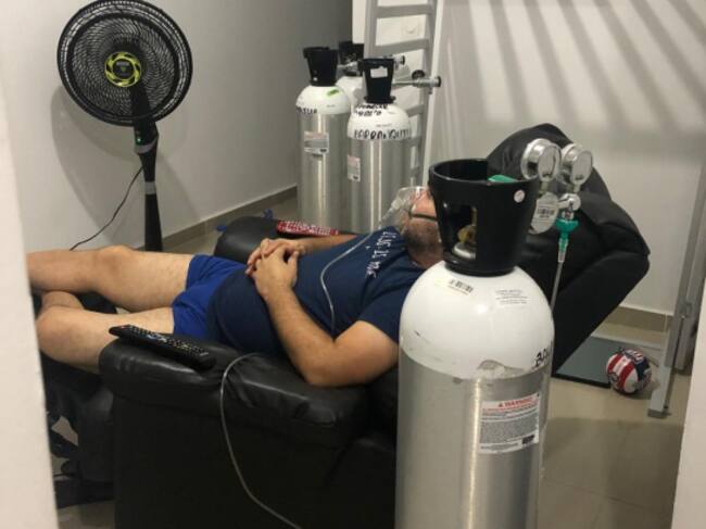 Eliseo Oliveros asegura que un primo suyo que padece COVID-19 requiere apoyo respiratorio para lo cual debe salir cada seis horas a recargar el cilindro de oxígeno en la IPS.