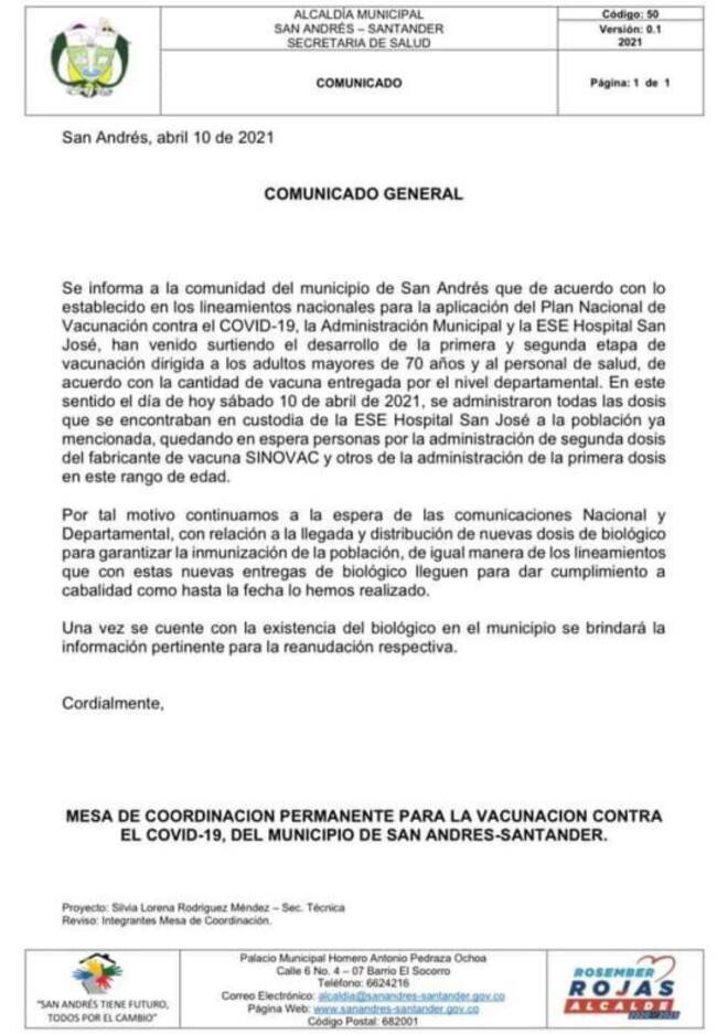 Según la Gobernación de Santander el municipio recibió 792 biológicos que ya aplicaron todos.
