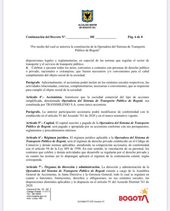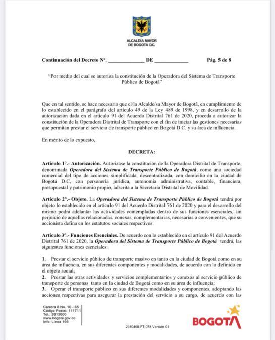 El Proyecto de Decreto publicado por al Secretaría de Movilidad, establece los lineamientos y autoriza la constitución de la Operadora Distrital de Transporte,