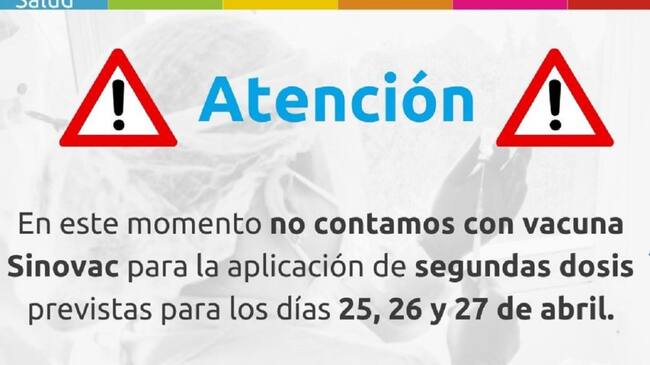 Desde Assbasalud indicaron que a los usuarios de 70 a 79 años que estaban citados para los días 24, 25 y 26 de abril para segundas dosis, se les cancela la aplicación ya que no han llegado vacunas.