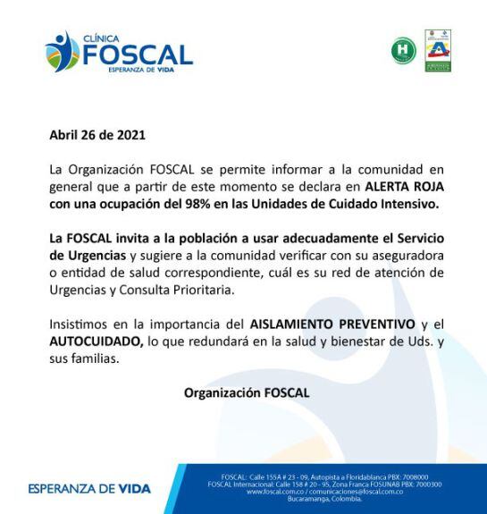 Foscal se suma a la alerta roja hospitalaria