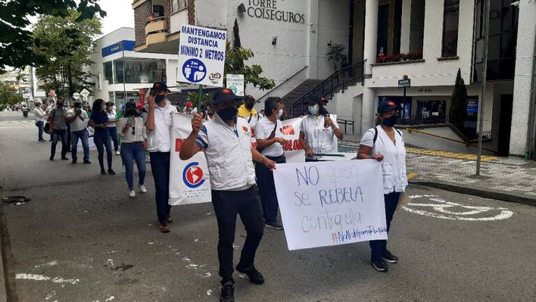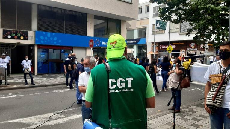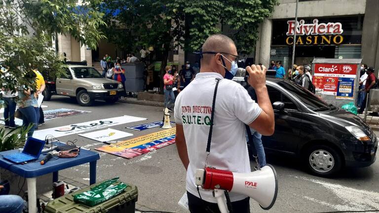 Con megáfono en mano Dimas Arias presidente de la CUT, Quindío