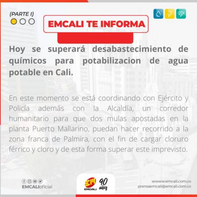 “Ya estamos coordinando para garantizar con apoyo del ejército esta movilización de los carrotanques con insumos y mantener la normalidad en el procesamiento del agua captada del rio Cauca”, añadió el gerente de EMCALI.