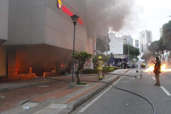 Una de las sucursales del Banco Davivienda fue blanco de ataques de personas no identificadas en Bucaramanga. La sede de la entidad credoiticia ubicada en la carrera 27 con avenida González Valencia ardió en llamas al caer la tarde de este domingo. Residentes de los edificios aledaños informaron que el fuego se produjo en medio de los distiurbios que volvieron a ocurrir en la ciudad, a pesar de que el presidente de la República, Iván Duque anunció el retiro del proyecto de reforma tributaria.