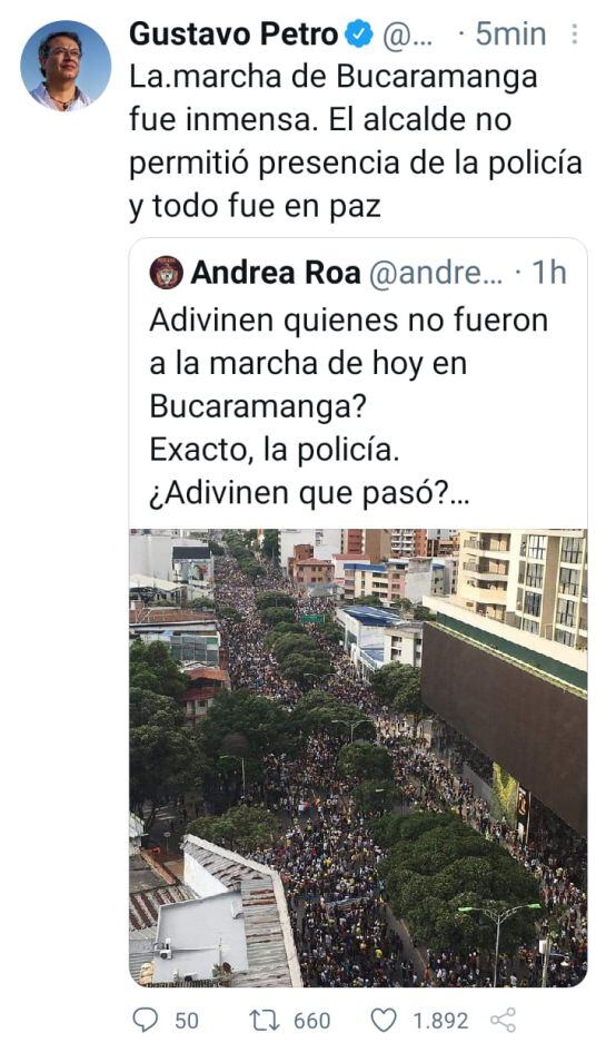 El excandidato presidencial Gustavo Petro se refirió al caso particular de las marchas de este miércoles en Santander. En Twitter expresó: "La marcha de Bucaramanga fue inmensa. El alcalde no permitió presencia de la policía y todo fue en paz".