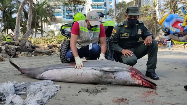 Un delfín adulto de la especie "nariz de botella" con aproximadamente 2.30 metros de largo, fue encontrado sin vida en las playas del barrio Bocagrande frente al hotel Decameron.